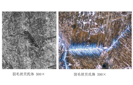 The microstructure of steel is observed using an optical microscope. Martensite appears dark, needle-like or lath-like; bainite appears gray, feathery, needle-like or granular; and pearlite shows a lamellar structure with alternating light and dark layers.